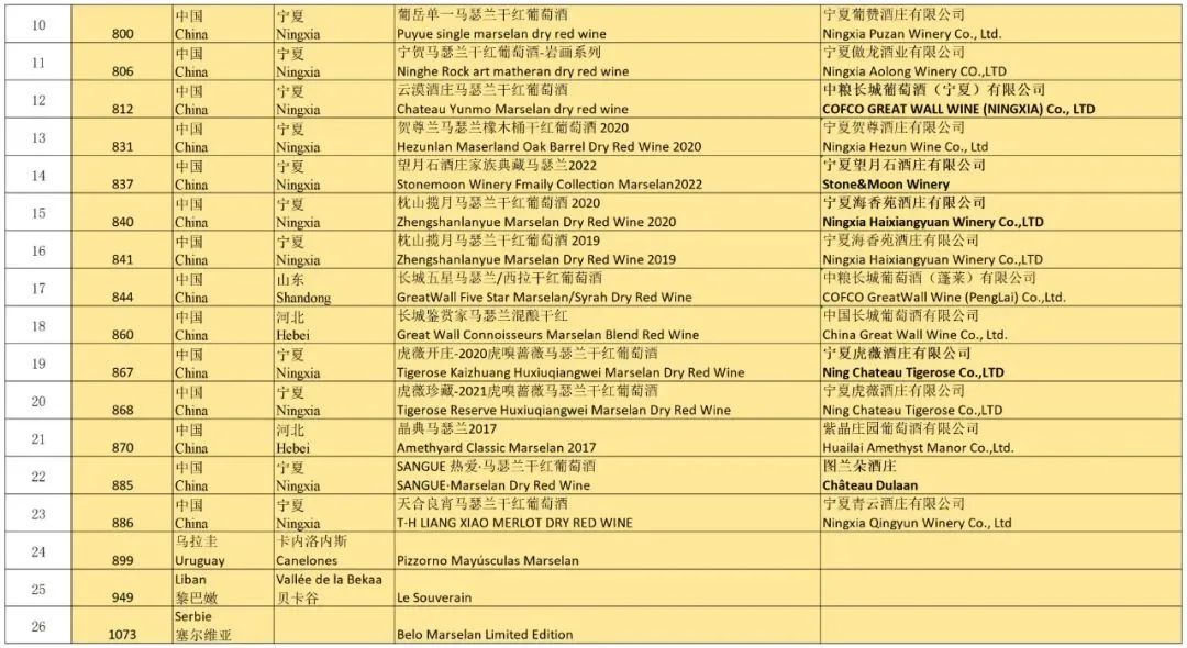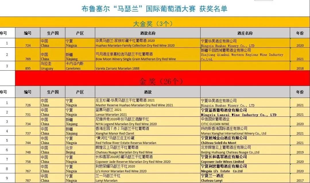 10月6日,首届布鲁塞尔“马瑟兰”国际葡萄酒大赛结果揭晓,共有67款葡萄酒获得奖项,其中大金奖3款、金奖26款、银奖38款。宁夏贺兰山东麓葡萄酒产区荣获大金奖1款,金奖17款,银奖21款。