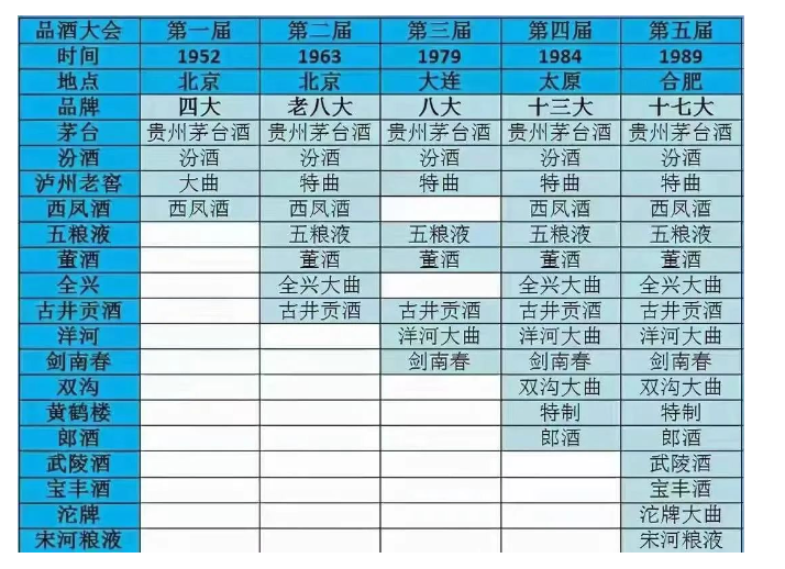 最后,关于前四届评选出的“中国名酒”,也就是行业通常提到的“四大名酒”、“老八大名酒”、“新八大名酒”和“十三大名酒”,以及“十七大名酒”,可以从下图中一目了然。例如,茅台、汾酒和泸州老窖是每一届都上榜的,而五粮液由于在第一届评选时尚未完全恢复生产,因此缺席,只上榜了四次,这也是“四大名酒”中没有五粮液的原因。
