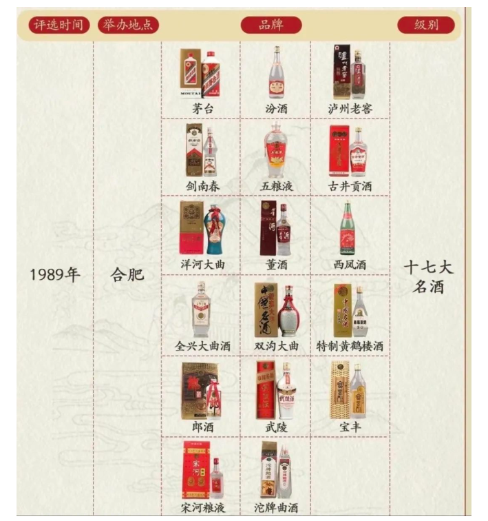 这5次评选中,每次上榜的酒和数量都有所不同,但最后一次评选将之前四次上榜的酒都列入了“十七大名酒”的行列,总共有17种,它们分别是: