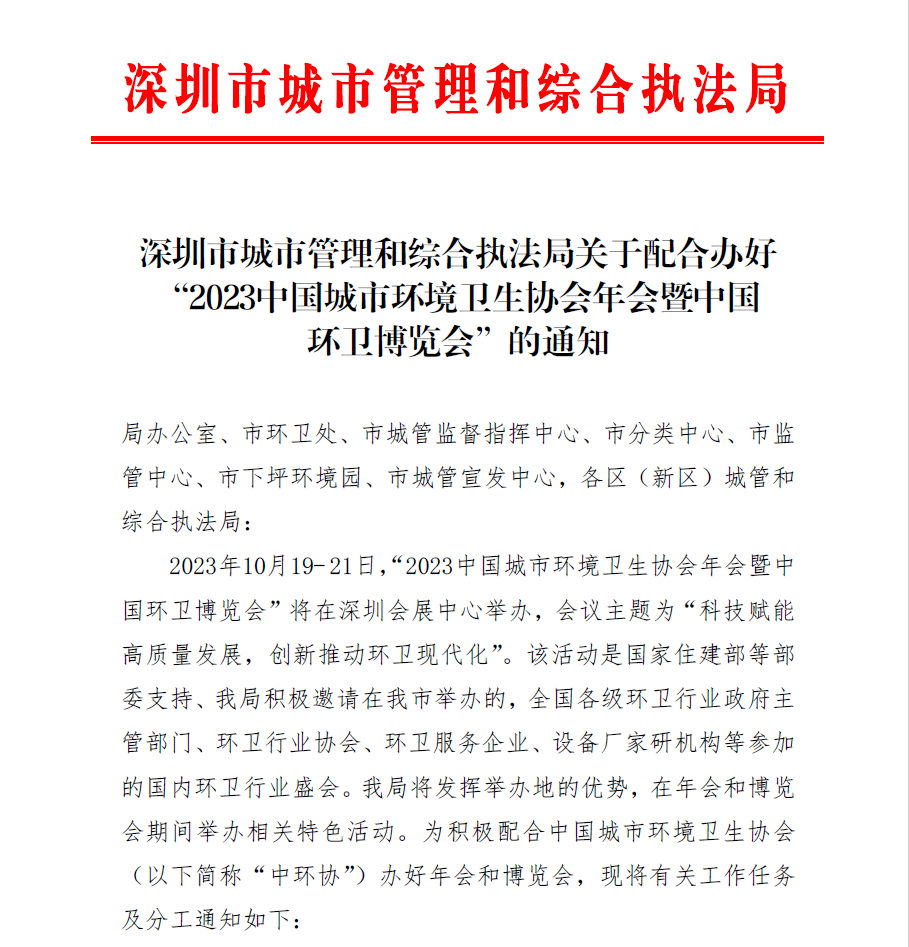 在此次盛会举办地——深圳,东道主深圳市城市管理和综合执法局(以下简称为“深圳城管局”)双节前发布通知,对配合办好2023中国城市环境卫生协会年会暨中国环卫博览会做出全面部署安排!