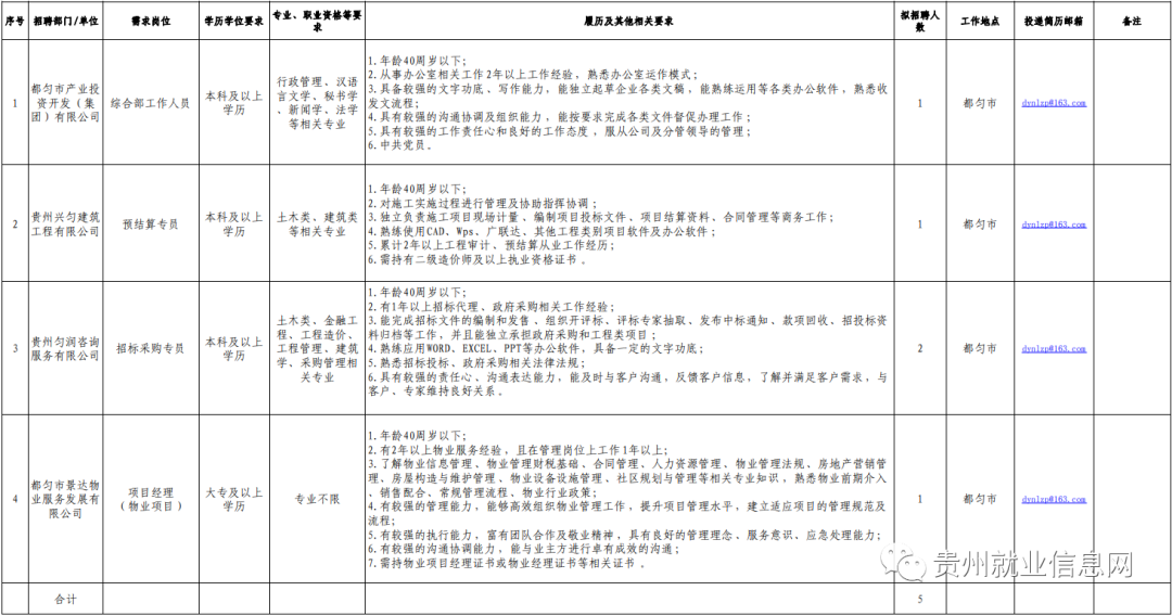 本次招聘共4个岗位,其中都匀市产业投资开发(集团)有限公司招聘综合部工作人员1人、贵州兴匀建筑工程有限公司招聘预结算专员1人、贵州匀润咨询服务有限公司招聘招标采购专员2人、都匀市景达物业服务发展有限公司招聘项目经理(物业项目)1人,具体详见《都匀市农旅产业发展集团有限公司2023年第三次公开招聘岗位一览表》(附件1)。