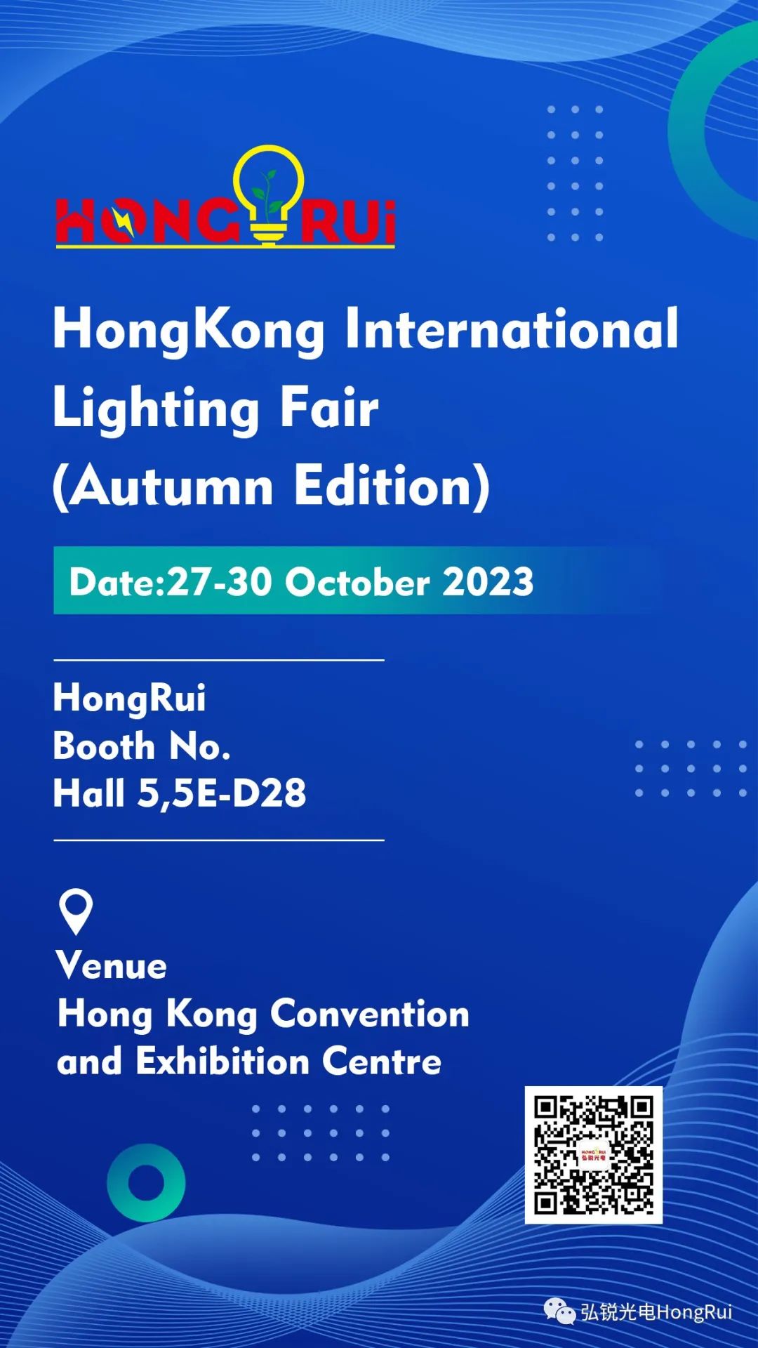2023年香港国际秋季灯饰展Hongkong International Lighting Fair (Autumn Edition) 将于10月27-30日在香港会议展览中心召开,弘锐光电展位号:5E-D28,期待新老客户莅临展位参观交流!
