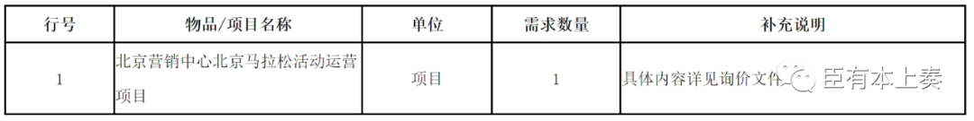 采购内容和范围:北京营销中心北京马拉松活动运营项目。具体内容详见询价文件