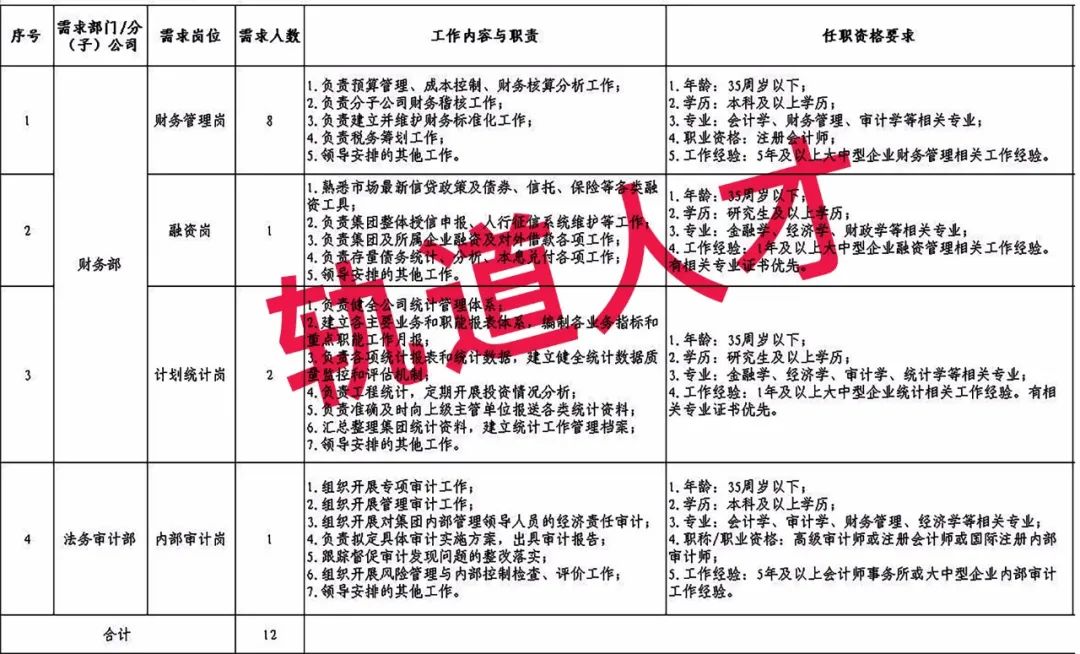 计划招聘财务部财务管理岗、融资岗等4个岗位共计12人,具体岗位信息如下: