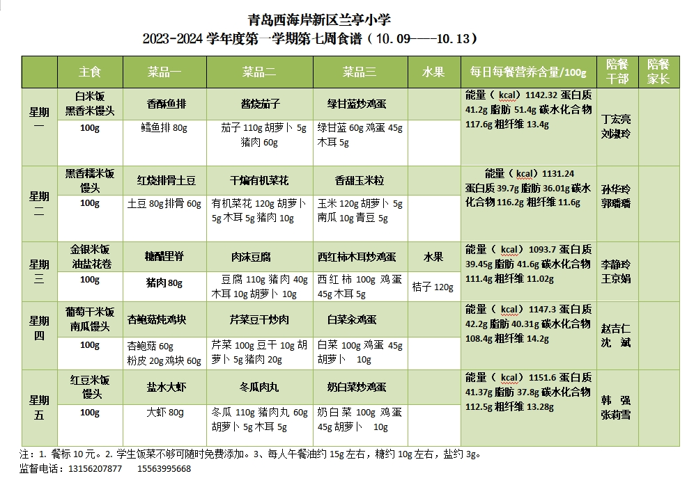 【兰亭小学教育集团校本部●食谱公示】2023年10月07日—10月13日学生午餐