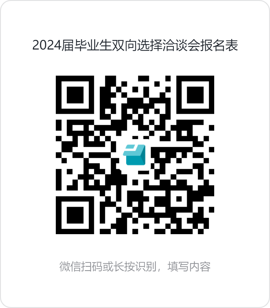 1.企业填报报名:请参会单位扫描“2024届毕业生双向选择洽谈会”二维码,进入后按要求逐项准确填写单位信息、上传相关资质材料进行填报报名。(上传成功后请保存入校登记码)