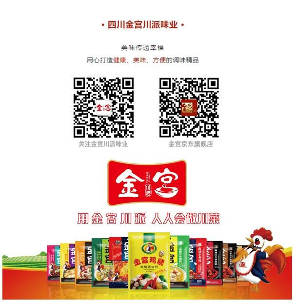 金宫品牌:金宫特级鸡精、金宫麻辣嫩鱼调料、金宫上汤酸菜鱼调料、金宫手工火锅底料、金宫番茄火锅底料、金宫香肠腊肉调料、川菜面食调料等;