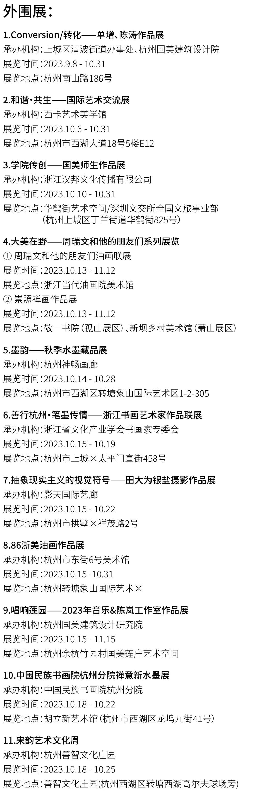第二十四届(2023)西湖艺术博览会将于10月19日至10月22日,在杭州浙江展览馆举办,展会主题为“艺启共享stART sharing”。恰逢第19届亚运会在杭州举办,西湖艺术博览会作为千年古都杭州的文化金名片将向亚洲和世界展现城市的创新活力!