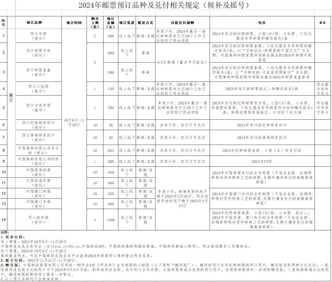 成功预订2024年套票(含册转票)客户,按照预订时参与活动确认,参加购买小批量品种盲盒摇号(《西游记(五)》四方连邮票折+《西游记(五)》全张邮票折+《太行山》长卷邮票折+《“一带一路”倡议提出十周年》三地小本票邮折),11月25日公布结果,11月26日9:00至11月29日18:00期间为中签客户支付阶段,逾期未支付视为放弃资格。2024年1月8日起可至线下网点领取。