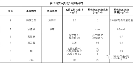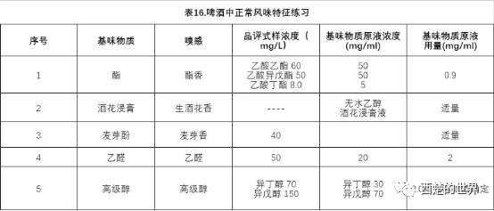 啤酒中正常风味特征练习见表16、啤酒中突出异味辨别练习见表17、啤酒中突出异味辨别练习见表18