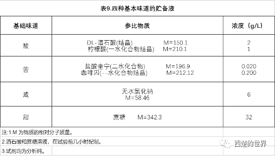 按表9制备四种基本味道的贮备液,然后分别按几何系列或算术系列制备稀释溶液,见表10 和表 11。