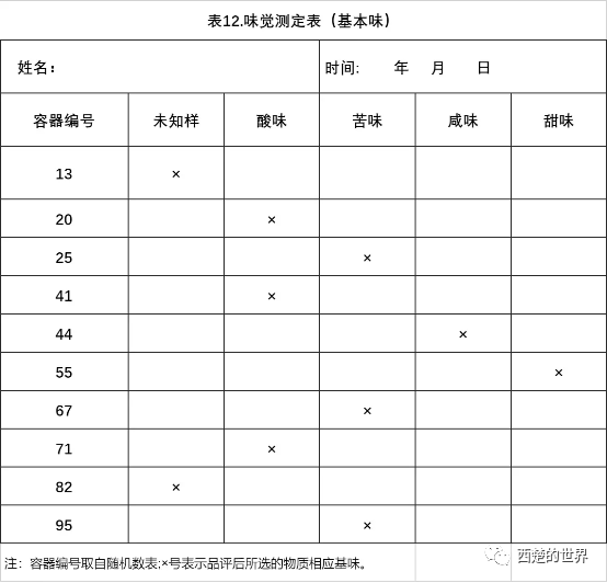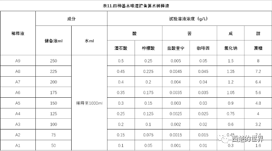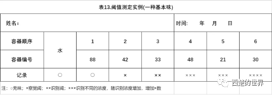 选用几何系列 G稀释溶液或算术系列 A 稀释溶液,分别放置在9个已编号的容器内,每种味道的溶液分别置于1~3 个容器中,另有一容器盛水,评价员按随机提供的顺序分别取约 15ml溶液,品尝后按表12 或表13填写