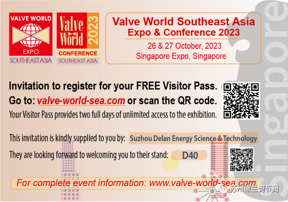 苏州德兰能源科技股份有限公司将于今年2023年10月26日-27日参加新加坡阀门世界展,届时苏州德兰将携产品出席这一重要行业展会,我们在此诚挚的邀请您参加!SUZHOU DELAN ENERGY SCIENCE & TECHNOLOGY CO., LTD. will participate in the Singapore Valve World Exhibition from October 26 to 27, 2023. At that time, Suzhou Delan will bring its products to attend this important industry exhibition. We sincerely invite you to participate!