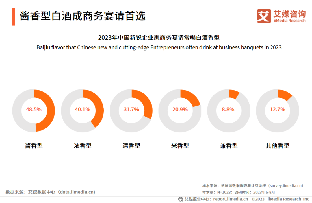 iiMedia Research(艾媒咨询)调研数据显示,在商务宴请场景中,新锐企业家最常喝酱香型白酒(48.5%)。艾媒咨询分析师认为,酱香型白酒对原料、酿造工艺等环节要求十分严苛,造就了酱香酒的独特口感,酒质有相应的保障,品质高有档次,招待客户不失体面。加上其对人体的刺激小,饮后的负面反应较小,作为商务接待用酒尤为适用。