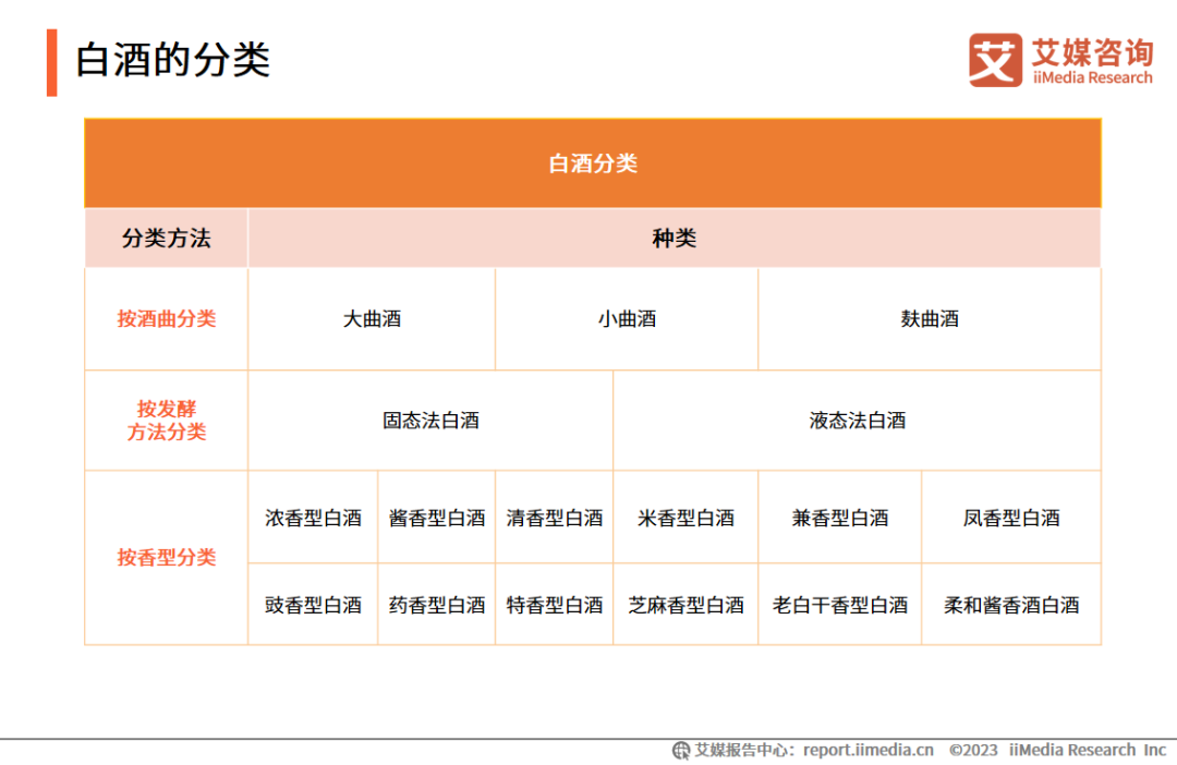 白酒是以高粱等谷物为主要原料,以大曲、小曲或麸曲及酒母等为糖化发酵剂,经蒸煮、糖化、发酵、蒸馏、陈酿和勾兑而酿制而成的各类酒。白酒主要有四种分类方式:按原料分类、按使用酒曲分类、按发酵方法分类、按香型分类。其中以香型分类的方法最为常用,可分为浓香型、酱香型、清香型、米香型等12种香型白酒。浓香型、酱香型和清香型是目前市面上最主要的白酒香型,被称为中国的三大香型白酒。