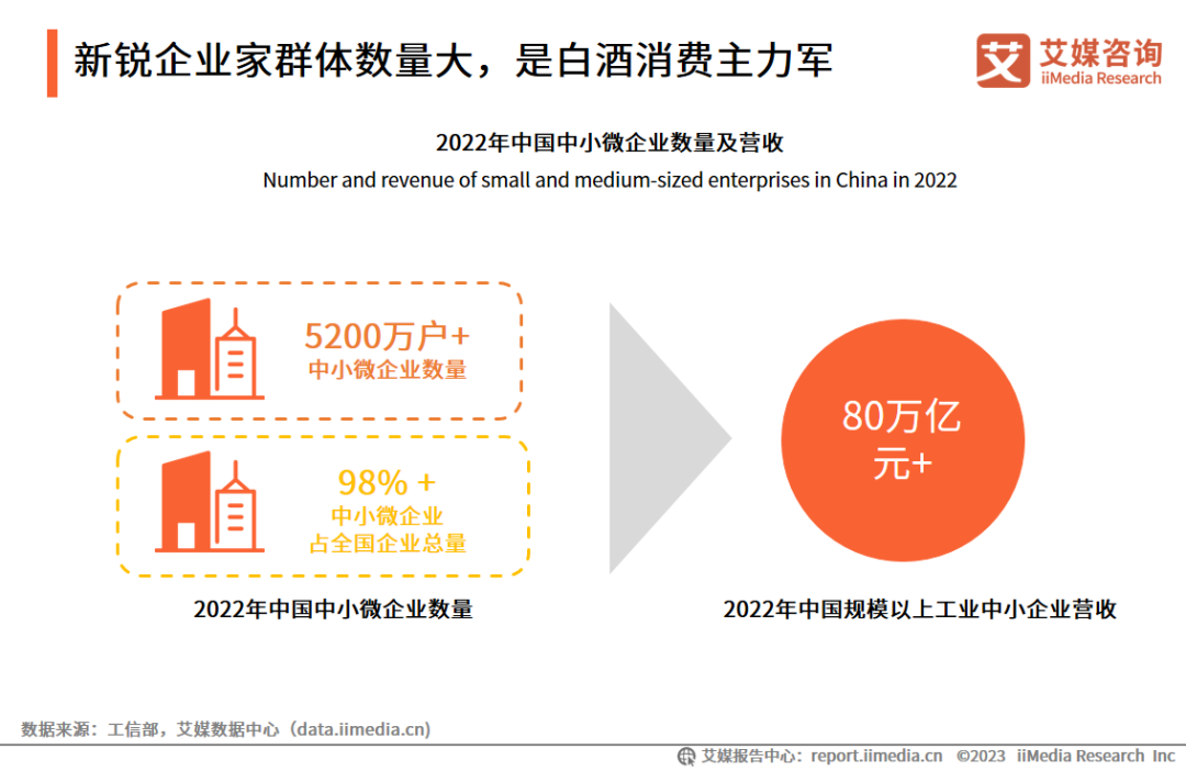 中小微企业已成为中国数量最大的企业群体,是中国国民经济的重要支柱。数据显示,2022年中国中小微企业数量已经超过了5200万户,占中国企业总量的98%以上。艾媒咨询分析师认为,经营中小微企业的新锐企业家群体数量巨大,该群体具有较高的收入且商务社交频繁,对白酒需求量大,是白酒市场的巨大增长点。