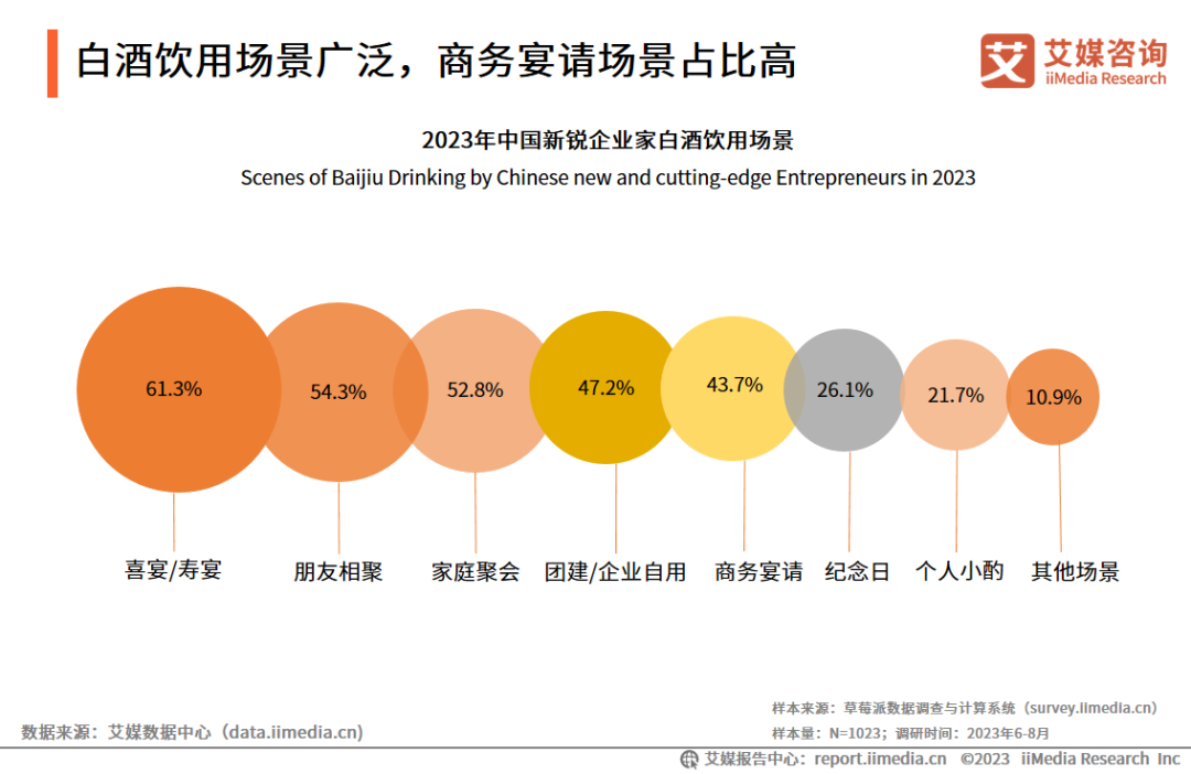 iiMedia Research(艾媒咨询)调研数据显示,白酒饮用场景分布中,喜宴/寿宴(61.3%)、朋友相聚(54.3%)、家庭聚会(52.8%)场景排名前三;团建/企业自用、商务宴请场景占比分别为47.2%、43.7%。艾媒咨询分析师认为,新锐企业家属于商务社交需求频繁人群,除喜宴/寿宴、家庭聚会等白酒高频饮用场景外,白酒也是商务宴请活动中的重要饮品。