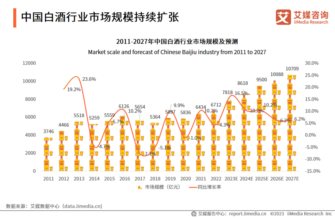 图表2.2011-2027年中国白酒行业市场规模及预测