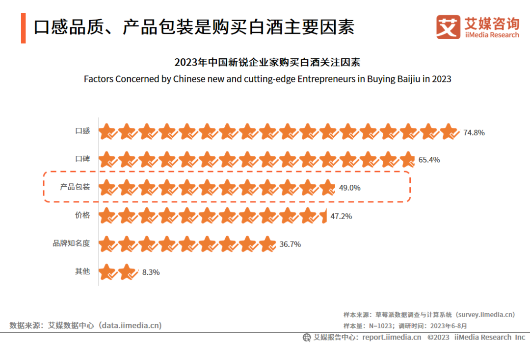 iiMedia Research(艾媒咨询)调研数据显示,新锐企业家购买白酒时主要关注口感(74.8%)。此外,产品口碑、包装、价格也是消费者关注的重要因素。商务宴请是新锐企业家饮用白酒的主要场景之一,选择一款口感醇正、包装精致的宴请用酒能体现不俗的宴会品味,体面不失档次。
