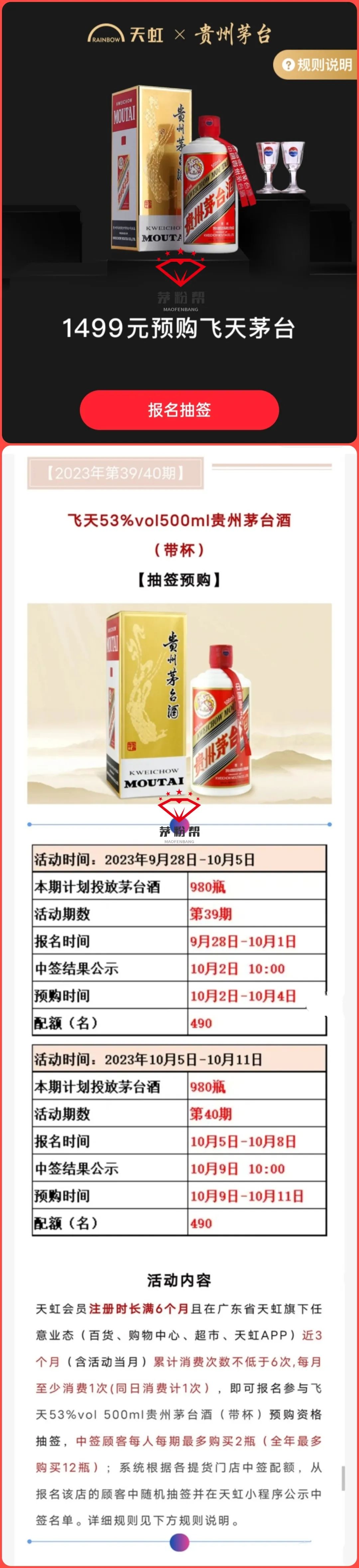 注册时长满6个月且在广东省天虹旗下任意业态(百货、购物中心、超市、便利店、天虹APP)近3个月(含活动当月)累计消费次数不低于5次,每月至少消费1次(同日消费计1次),即可报名参与飞天53%vol500ml贵州茅台酒(带杯)预购资格抽签,中签顾客每人每期最多购买2瓶!
