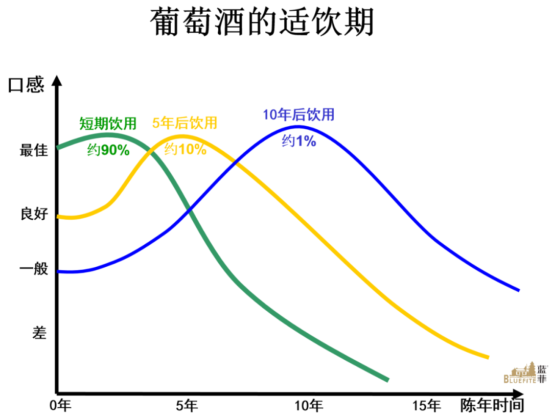 第一个方法是,直接从葡萄酒的年龄判断。一般普通的葡萄酒都是在2年内饮用是最佳,5年内仍可饮用(市场占比90%),5年以上谨慎饮用;好的葡萄酒在5年饮用最佳,10年内仍可饮用(市场占比10%),10年以上谨慎饮用;极好品质的葡萄酒则在10年饮用最佳,15年内仍可饮用(市场占比1%),15年以上谨慎饮用(但也有些品质特优,这类除外)。