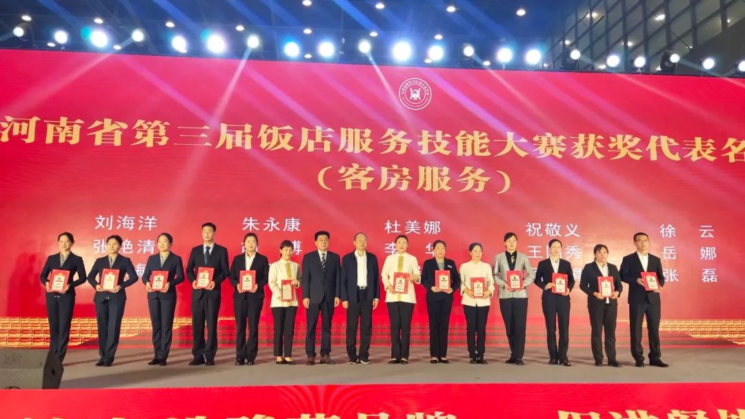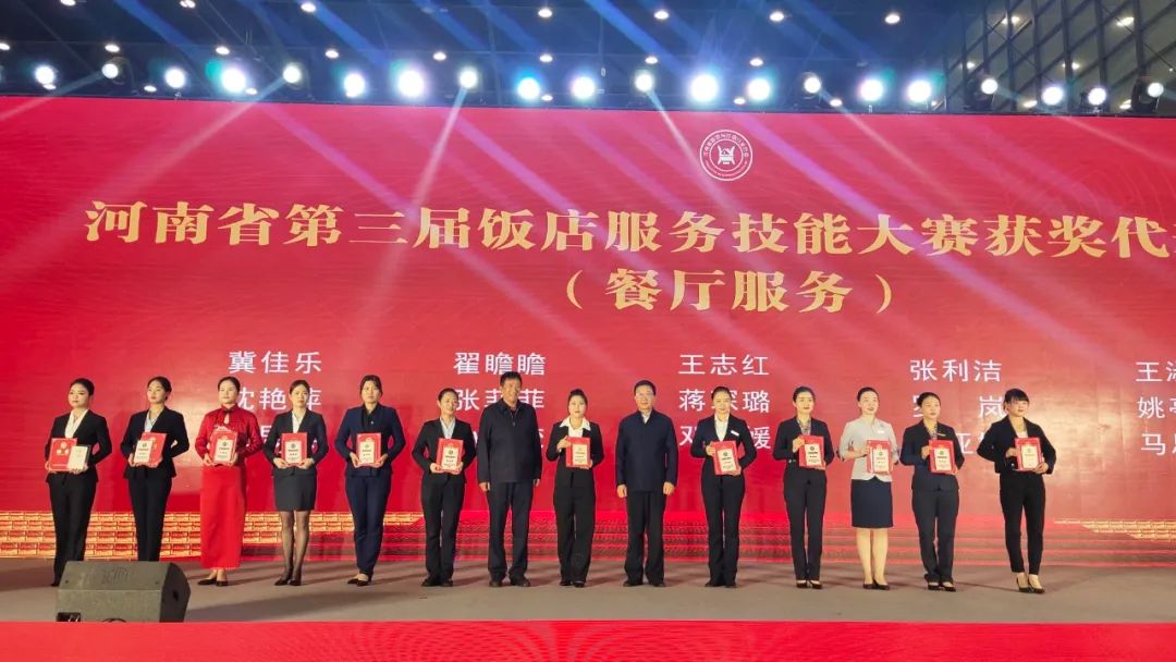 颁奖环节,荣获河南省第六届豫菜品牌大赛河南传统风味宴席赛特金奖的单位代表、荣获河南省第八届烹饪技能大赛中式烹调赛项特金奖前15名的选手、荣获河南省第八届烹饪技能大赛中式面点赛项特金奖前15名的选手、荣获河南省第三届饭店服务技能大赛餐厅服务赛项特金奖前15名的选手、荣获河南省第三届饭店服务技能大赛客房服务赛项特金奖前15名的选手作为“三项大赛”获奖选手代表上台领奖。