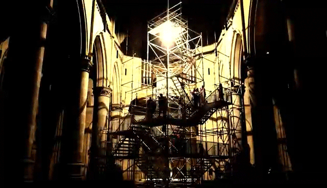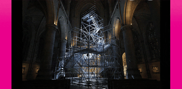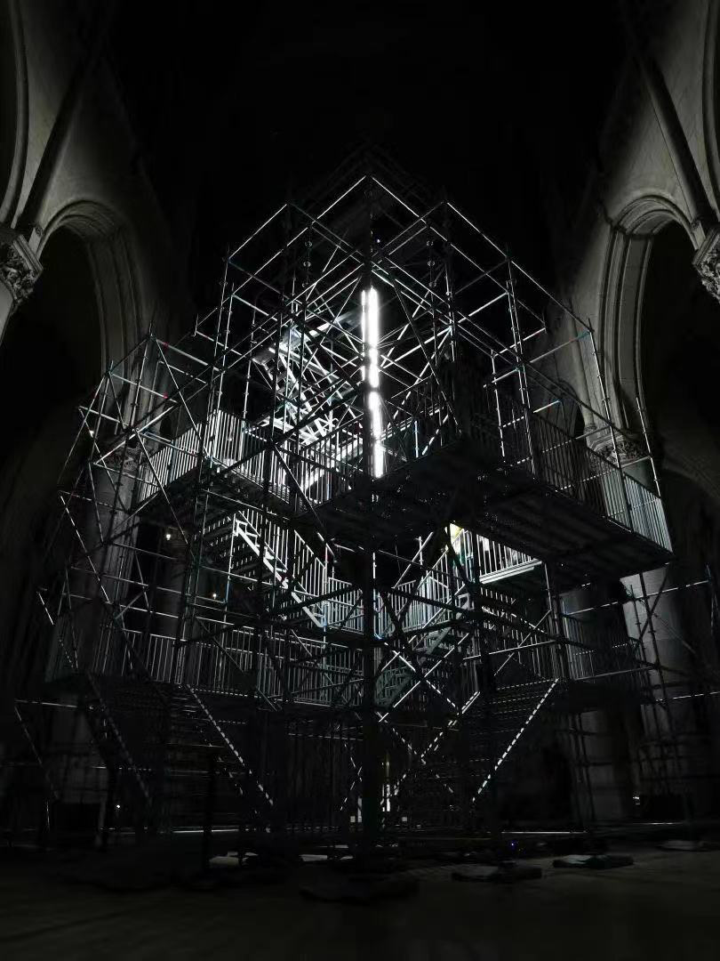 观众绕阶梯行走,可体验艺术家设定的若干个“日夜交替”,打开了通向不同次元的通道。震慑的声场,牵引着观众直逼巨型矩阵,仪式感与联觉,给观众带来开放回合的遐想。