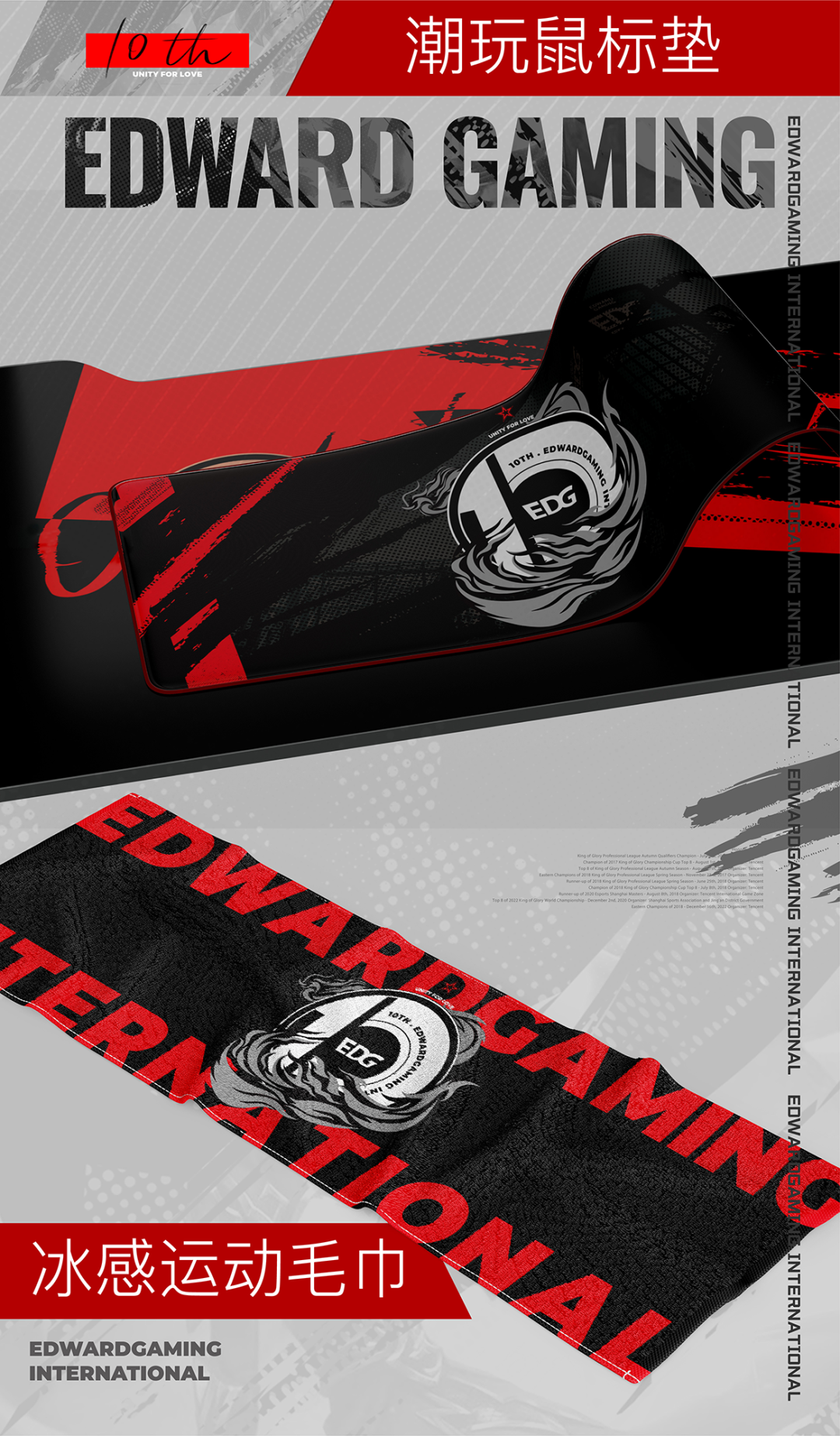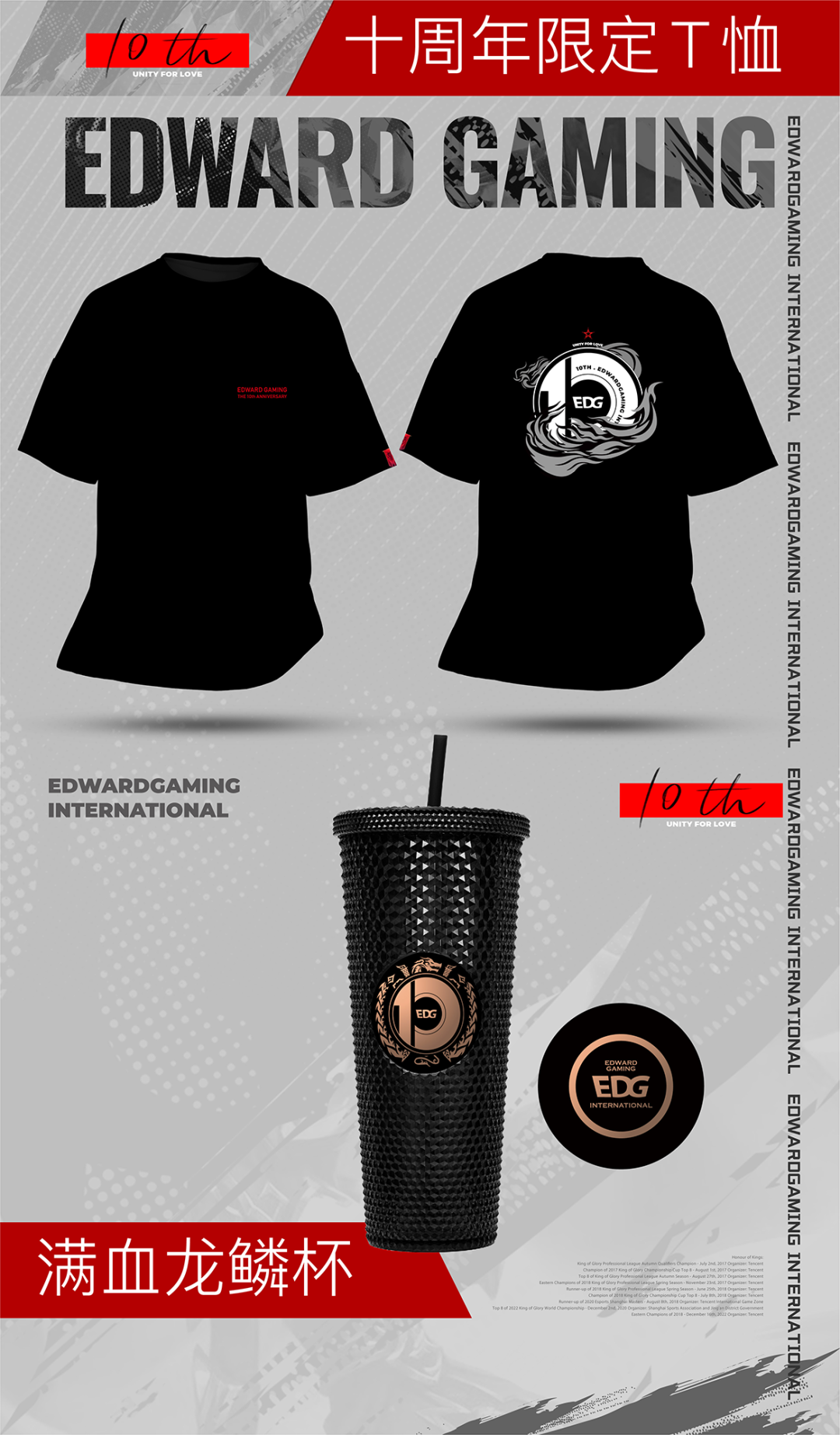 年轻先锋设计师倾力呈现,打磨十周年限定T恤、龙鳞杯、潮玩鼠标垫、冰感运动毛巾、十周年典藏纪念册,更有神秘惊喜藏匿其中!快来现场为EDG打call!