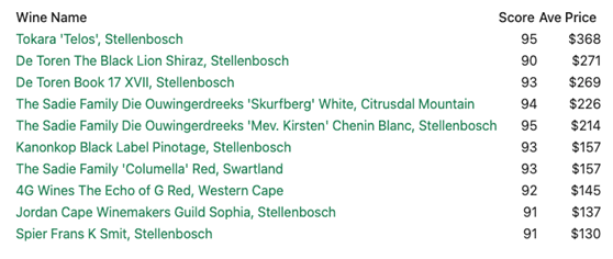 在近日整理出的南非最昂贵葡萄酒排行中,Tokara 'Telos'以$368的价格稳坐榜首,得分高达95分。而历史悠久的De Toren酒庄也有两款葡萄酒入围前三,分别是价格为$271、得分90分的The Black Lion Shiraz和价格为$269、得分93分的Book 17 XVII。