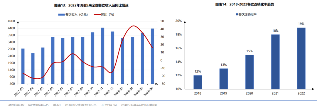 2022年,中国全年餐饮收入突破4 万亿人民币,在两个特定月份中,餐饮业增速都超越了社会零售总额的同比增速。2023年,餐饮业复苏,1-6月全国餐饮收入达24329亿元,同比增长21.4%,已超越疫情前水平。