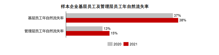 《2022 年中国连锁餐饮行业报告》指出,餐饮企业中,管理层员工的流失率整体在13%到15%左右,基层员工的流失率在37%到38%左右,管理层员工的流失率显著低于基层员工的流失率。远高于其他行业5%到10%的流动率。
