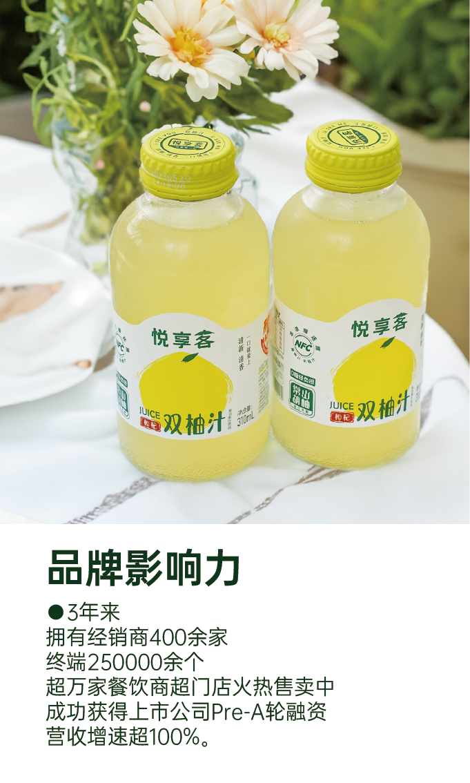 悦享客双柚汁采用双柚+枸杞的新颖搭配,温平均衡,口感清爽酸甜、解油解腻,适合佐餐、宴会饮用等多种场景。