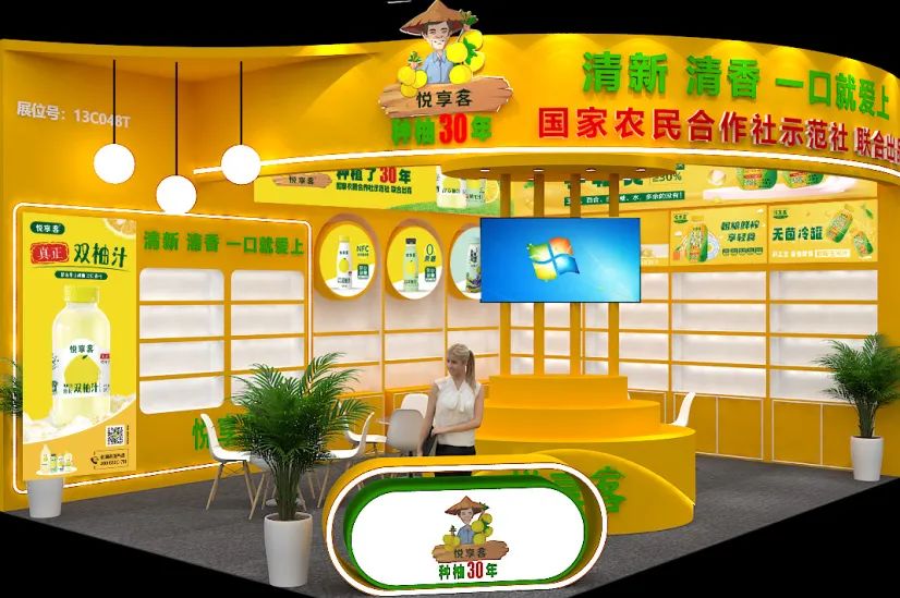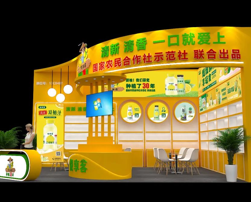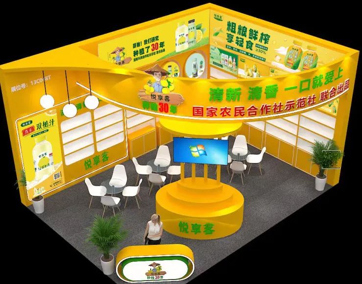 明亮的橘黄色调展位,醒目显眼,在展柜上陈列着的是悦享客主打产品--NFC双柚汁、NFC鲜榨玉米汁,悦享客团队将准时在展位上静候各位伙伴前来,一起商讨洽谈。