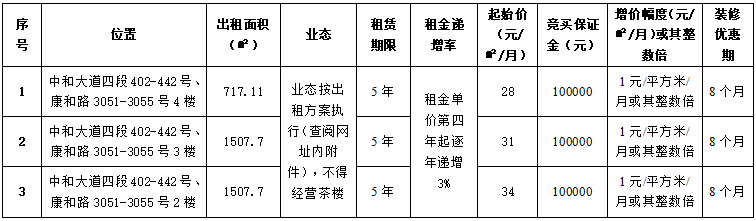 根据《成都市人民政府办公厅关于印发成都市公共资源交易目录(2021年版)》(成办发〔2021〕60号)、《关于印发〈成都市市属国有企业资产出租项目进场交易管理规则〉的通知》(成国资〔2014〕7号)、《关于修订〈成都市市属国有企业资产出租项目进场交易管理规则〉部分条款的通知》(成国资发〔2015〕23号)政策文件规定,成都高投资产经营管理有限公司以网络竞价方式公开出租下列标的物,现将有关事项公告如下: