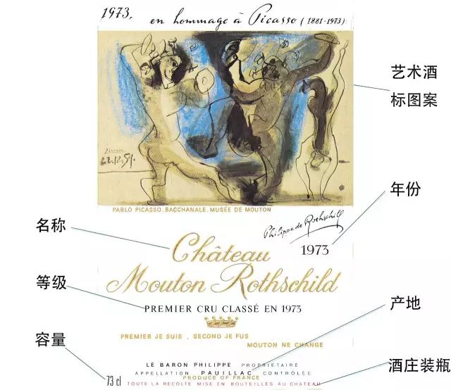 波尔多很多葡萄酒的酒标图案都跟酒庄建筑有关,如玛歌酒庄(Chateau Margaux)葡萄酒的酒标图案是该酒庄建筑的正面图。但是也有例外,比如木桐酒庄的酒标图案就别具一格,极具收藏价值。自 1945 年起,木桐酒庄每年(2000 年除外,这个千禧年只挑选了酒庄酒标艺术博物馆里的一座公羊雕像作为主题)都会邀请一位艺术家为酒庄正牌酒的酒标进行创作。酒标上标注的年份即酿酒葡萄的采摘年份。酒标上的年份除了可以告诉我们这瓶酒的“年龄”,还对该瓶酒的质量有一定的指导意义。对一些声誉良好、追求品质的酒庄而言,年份的指导意义非常大,在好年份里葡萄酒的品质会更好一些,在差年份里则表现得不尽如人意。波尔多的好年份包括 2010 年、2009 年、2005 年、2000 年、1990 年和 1982 年等。波尔多葡萄酒的常规容量是 750ml,也可以写成 0.75L。