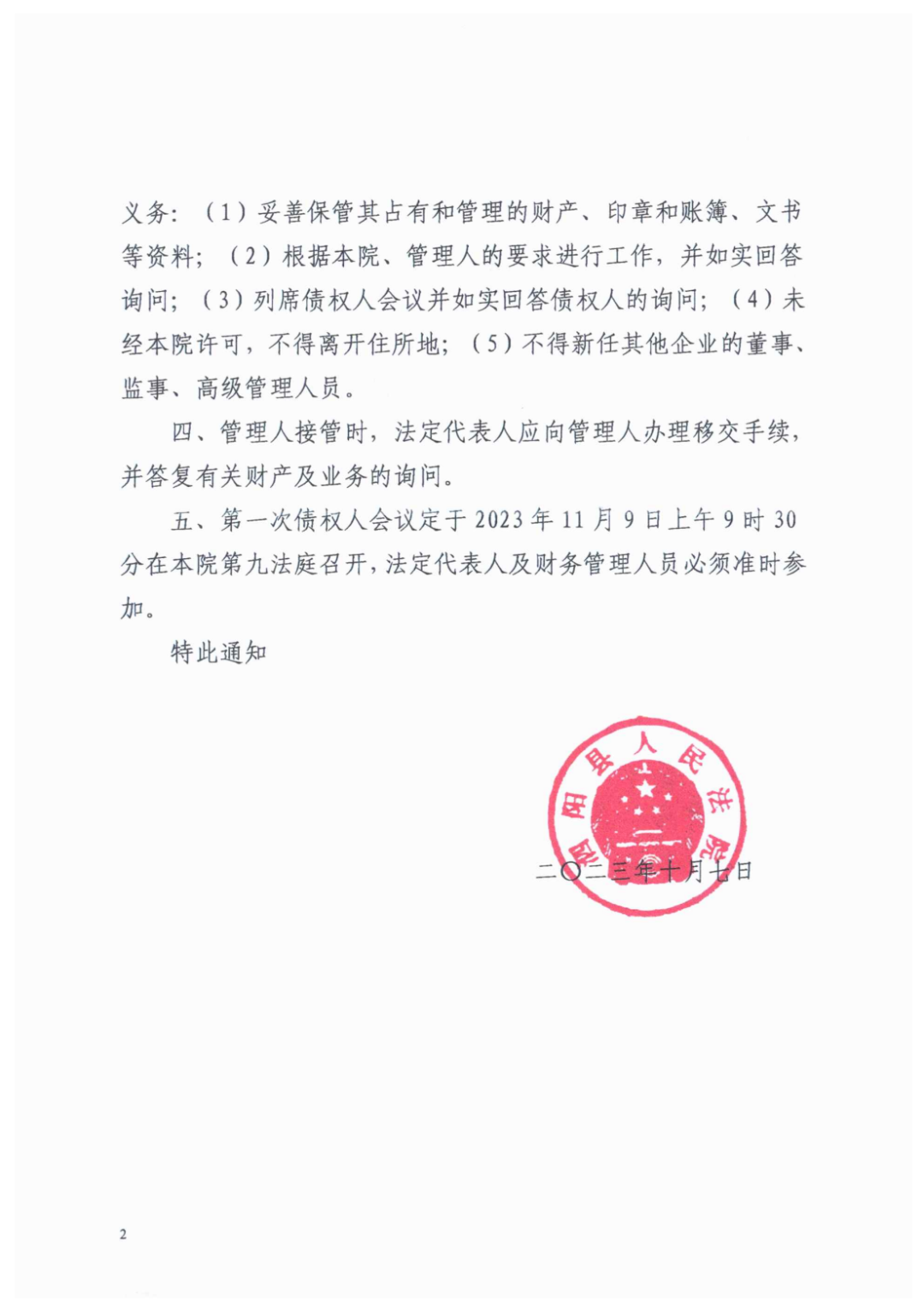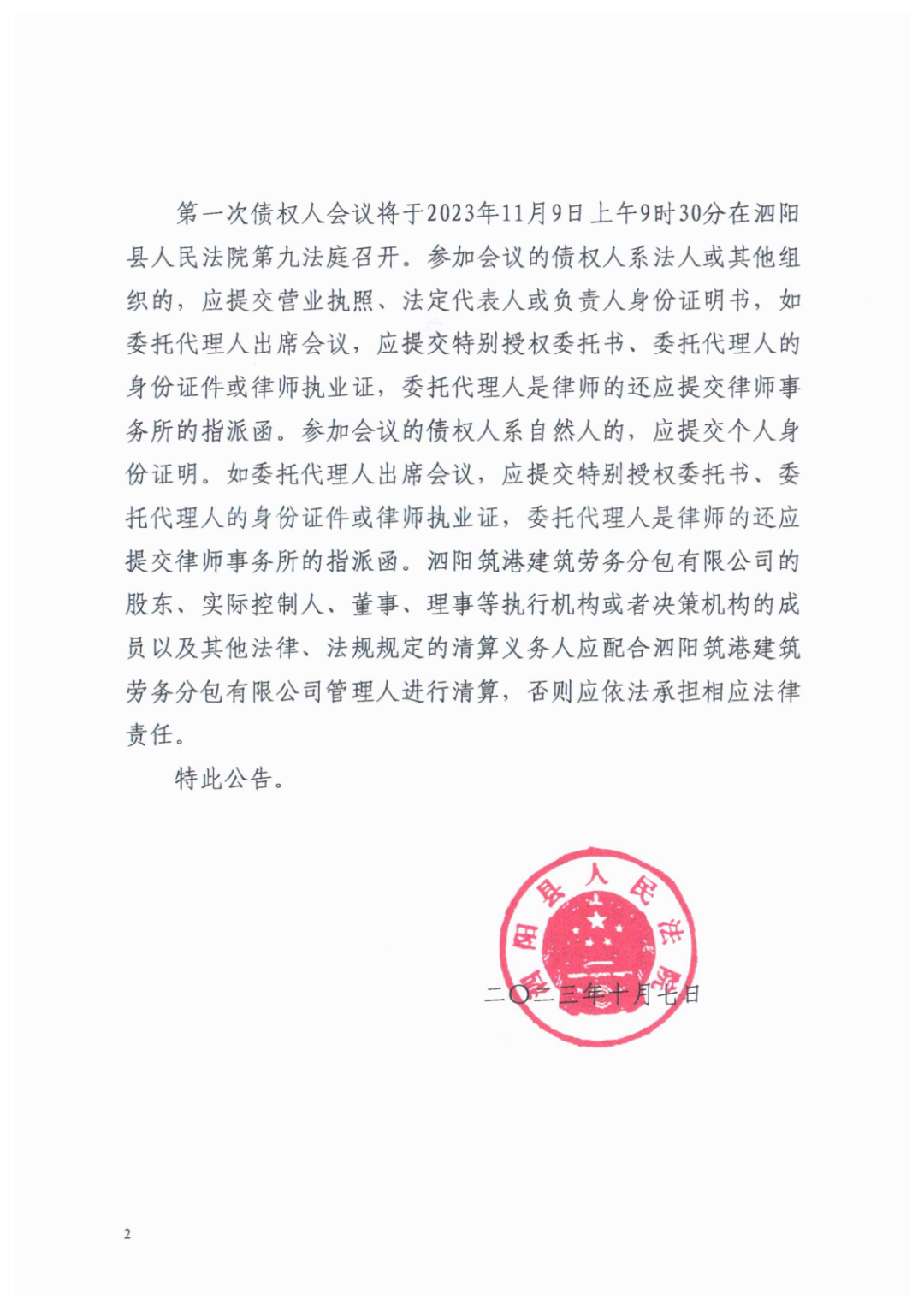 第一次债权人会议将于2023年11月9日上午9时30分在泗阳县人民法院第九法庭召开。参加会议的债权人系法人或其他组织的,应提交营业执照、法定代表人或负责人身份证明书,如委托代理人出席会议,应提交特别授权委托书、委托代理人的 身份证件或律师执业证,委托代理人是律师的还应提交律师事务所的指派函。参加会议的债权人系自然人的,应提交个人身份证明。如委托代理人出席会议,应提交特别授权委托书、委托代理人的身份证件或律师执业证,委托代理人是律师的还应提交律师事务所的指派函。泗阳筑港建筑劳务分包有限公司的股东、实际控制人、董事、理事等执行机构或者决策机构的成员以及其他法律、法规规定的清算义务人应配合泗阳筑港建筑劳务分包有限公司管理人进行清算,否则应依法承担相应法律责任。