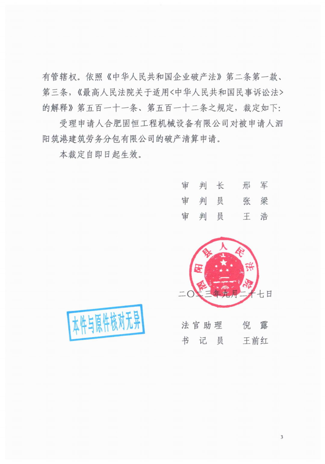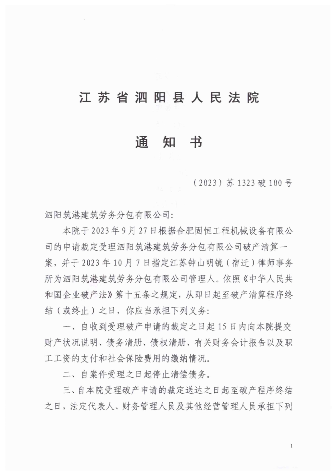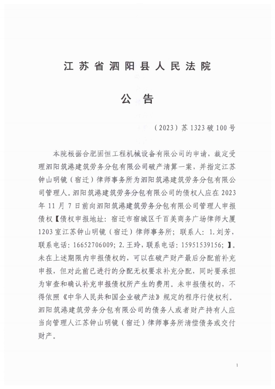 泗阳县人民法院根据合肥固恒工程机械设备有限公司的申请,裁定受理泗阳筑港建筑劳务分包有限公司破产清算一案,并指定江苏钟山明镜(宿迁)律师事务所为泗阳筑港建筑劳务分包有限公司管理人。泗阳筑港建筑劳务分包有限公司的债权人应在2023年11月7日前向泗阳筑港建筑劳务分包有限公司管理人申报债权【债权申报地址:宿迁市宿城区千百美商务广场律师大厦11楼1113室〈江苏钟山明镜(宿迁)律师事务所〉;联系人:1.刘芳, 联系电话:16652706009;2.王玲,联系电话:15951539156;】。未在上述期限内申报债权的,可以在破产财产最后分配前补充申报,但对此前已进行的分配无权要求补充分配,同时要承担为审查和确认补充申报债权所产生的费用。未申报债权的,不得依照《中华人民共和国企业破产法》规定的程序行使权利。泗阳筑港建筑劳务分包有限公司的债务人或者财产持有人应当向管理人江苏钟山明镜(宿迁)律师事务所清偿债务或交付财产。