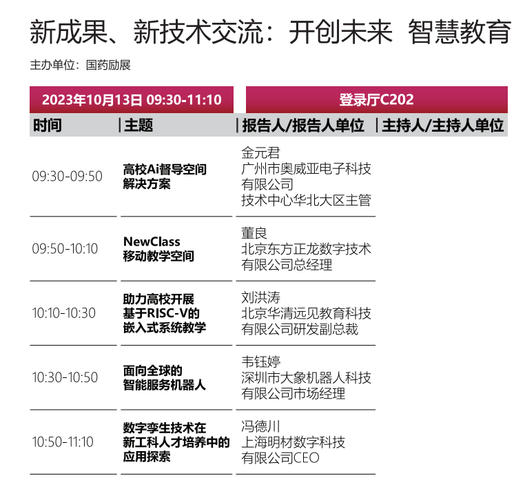 在交流上广州奥威亚电子科技有限公司将带来高校AI督导空间解决方案的介绍,加速推进高校教育数字化转型,北京东方正龙数字技术有限公司也将带来NewClass移动教学空间等最新产品及解决方案亮相;北京华清远见教育科技游侠公司则将带来最新方案《助力高校开展基于RISC-V的嵌入式系统教学》,用科技手段赋能教学服务与人才培养;深圳市大象机器人科技有限公司将带领大家全面了解面向全球的智能服务机器人;上海明材数字科技也将与大家共同探讨数字孪生技术在新工科人才培养中的应用探索。