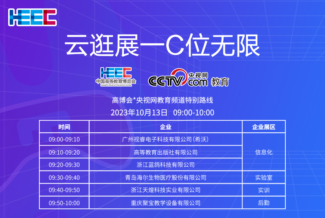 10月13号关注央视网教育频道焦点图、央视影音APP教育频道焦点图及高博会官方网站、视频号、直播平台,即可一键开启云逛展。