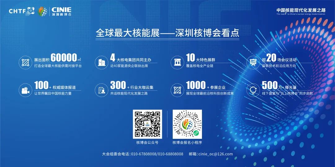 中国核能高质量发展大会暨深圳国际核能产业创新博览会(简称“深圳核博会”)将于11月15-18日在深圳国际会展中心举办。大会由中国能源研究会、中国广核集团有限公司、深圳市发展和改革委员会共同主办,中核集团、中国华能、中国大唐、国家电投、国家能源集团联合主办,主题为“核聚湾区·能动世界”。