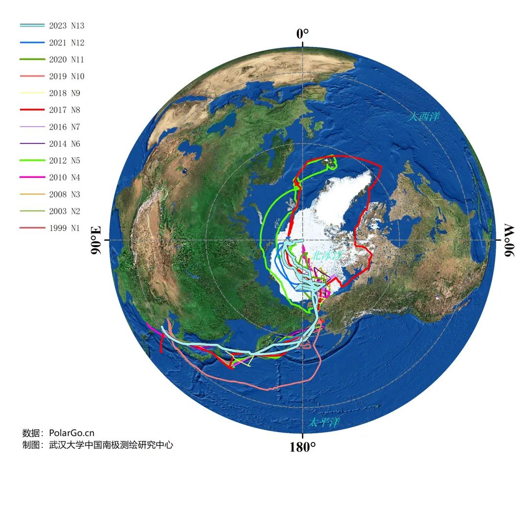中国破冰船历次北极考察航迹