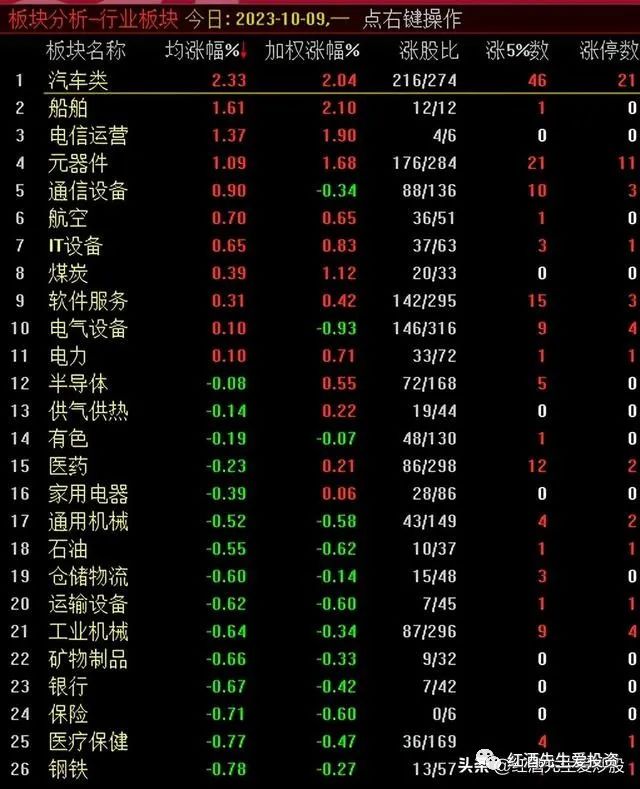 行业个股方面,今天华为汽车概念股强势领涨两市,掀起涨停潮,数字经济类科技股也都有比较好的表现,而餐饮、旅游、传媒娱乐、消费类等板块个股诡异的大幅下跌,按说国庆节、中秋假期旅游消费业绩好转,相关股票该涨才对,但现在却反其道而行之,这该怎么理解?其实这又是典型的人为制造的震仓打压诱空,短线震荡陷阱而已,而且是最后的加速放量挖坑赶底,别看现在砸盘凶狠,后面会逐渐震荡企稳,本月会走出先抑后扬的走势。所以,大家不要随便追涨杀跌,尤其是在当前的低位区域,上涨的不见得是真涨,下跌不见得是真跌。