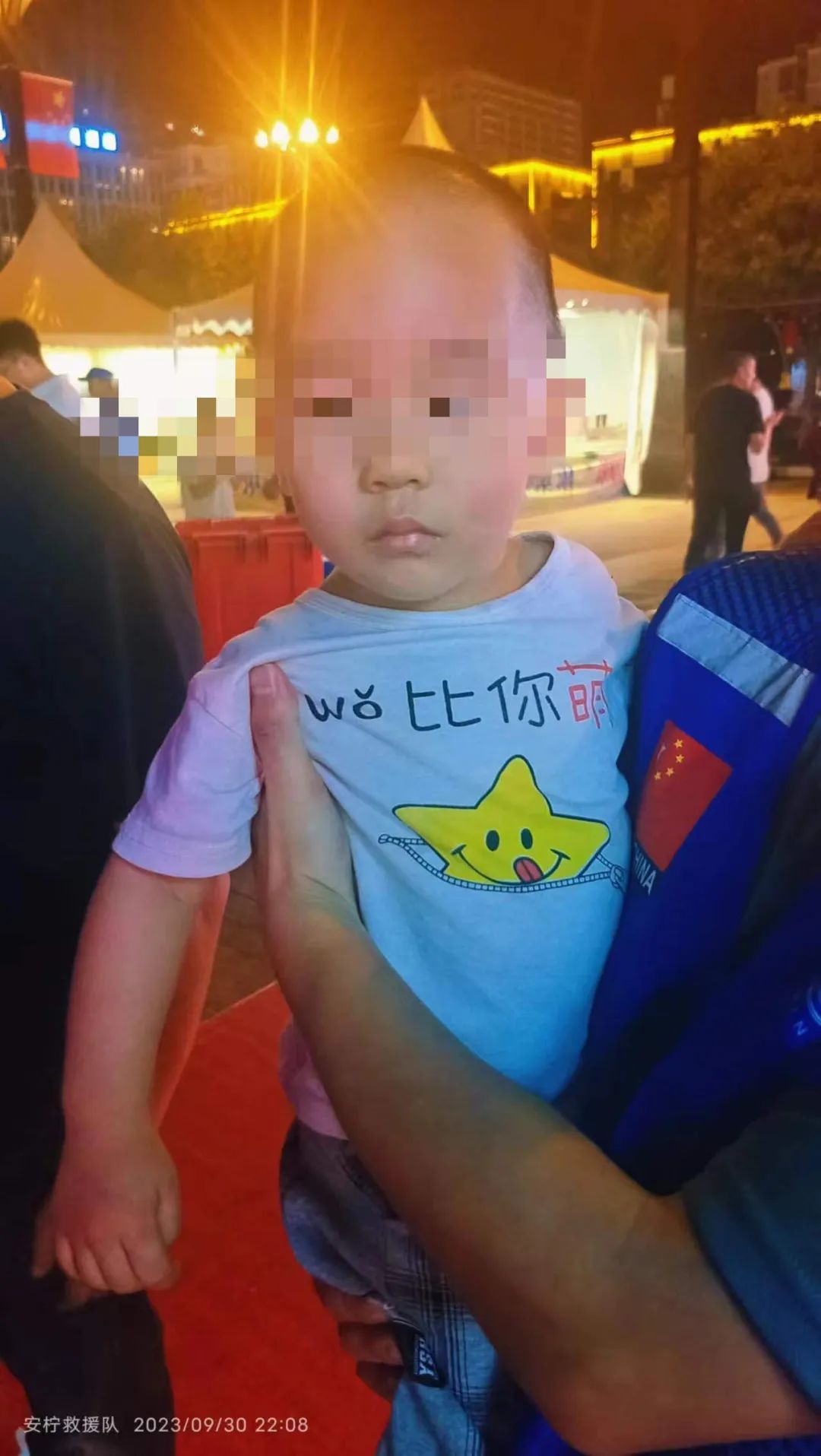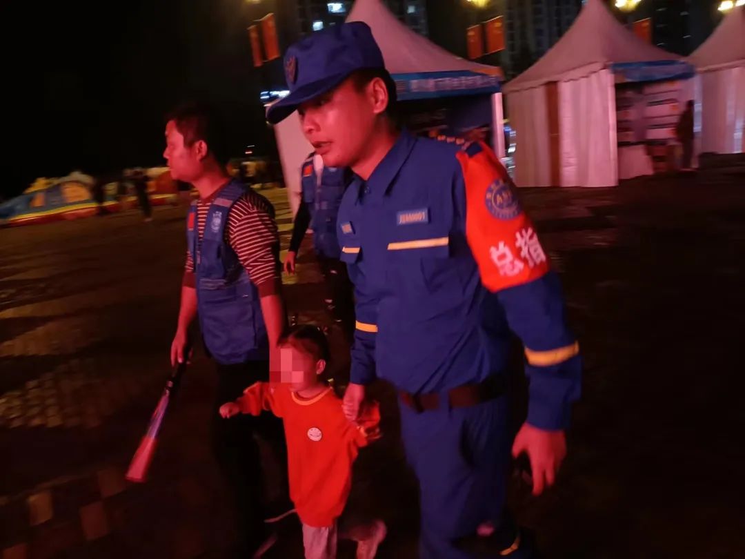 9月30日晚十点过,一位小孩与家长走散,安柠救援队的队友一边安抚小孩,一边派人队友在现场寻找小孩的家长 ,小孩很快被家长领回。