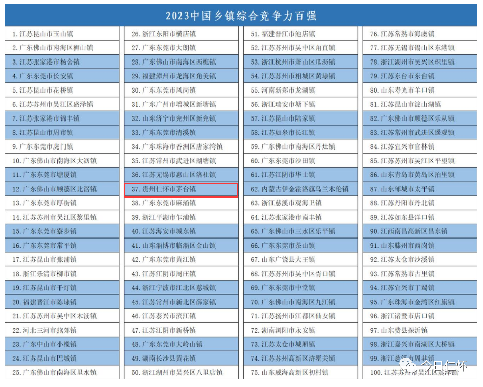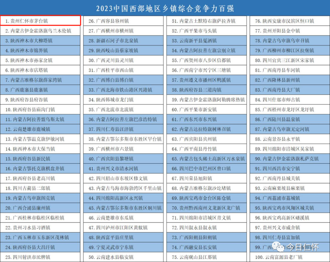 近日,2023全国乡镇高质量发展交流会上,发布了《中国乡镇综合竞争力报告2023》,揭晓2023中国百强镇、2023中国中部百强镇、2023中国西部百强镇。其中,仁怀市茅台镇入选2023中国乡镇综合竞争力百强镇,是贵州省唯一入选的乡镇。同时,茅台镇还入选2023中国西部地区乡镇综合竞争力百强镇。