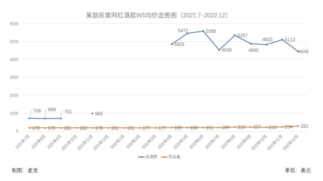 中间数月,该酒款在WS突然销声匿迹,而在2022年4月当它再次回归时,均价突然飙升到4859美元,仅仅2个月后更是达到最高点5588美元,足足是起始价的7倍有余,这显然是人为炒作的结果,因为同品类的均价几乎没有波动。