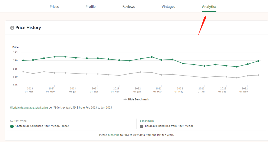 Price History,可以看到过去两年一款酒的价格走势(如果升级到付费版,则是十年),下方还有该酒款在WS的报价数量(Availabity Over Time)及WS搜索排名(Search Rank Over Time),可供参考: