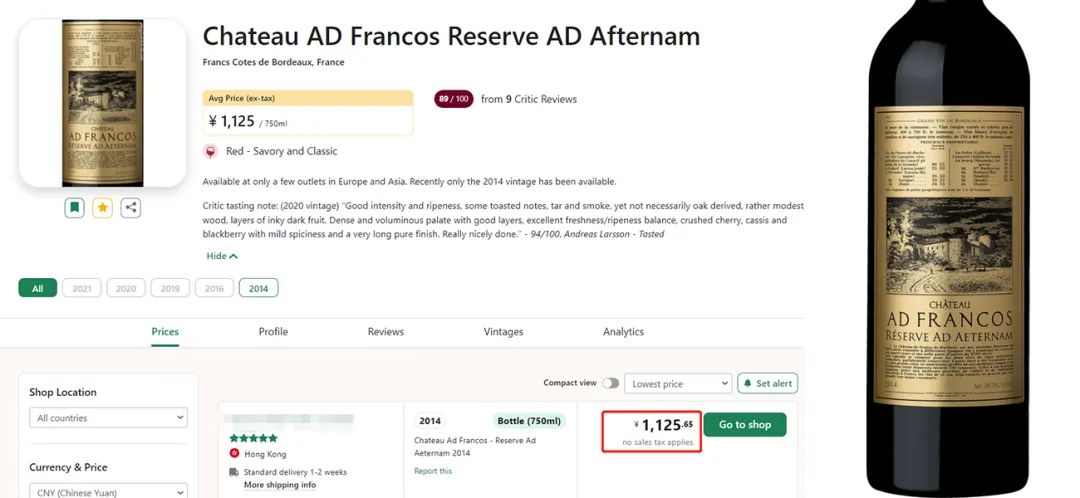 事实上,这款酒来自波尔多右岸的法兰克丘产区(Cotes de Francs),整个WS只有一个来自香港的电商报价,对于这个冷门产区的出品来说,1125元这个价格很显然缺乏可信度。