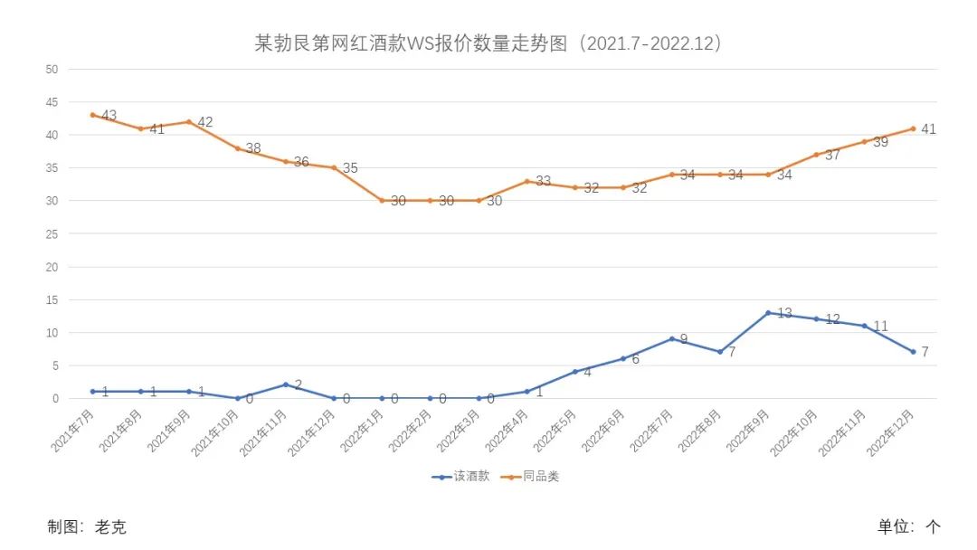 下图是该酒款在WS的用户搜索排名,一直遥遥领先同品类,即使在WS无报价的那几个月间也不例外,大概率是营销造势的结果: