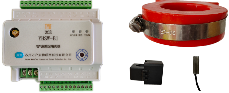 用来监测380V电压线路的终端系统,主要是由4个部分组成,分别为B1的主体设备、剩余互感器、电流互感器、温度传感器。B1的主体设备安装用于监测三相电的电箱,用来收集传感器的数据,并上传到平台,分析线路问题等功能。剩余互感器是用来监测零线和三根相线剩余电流,电流互感器是用来单独监测单根相线电流,温度传感器是用来监测零线和三根相线温度。