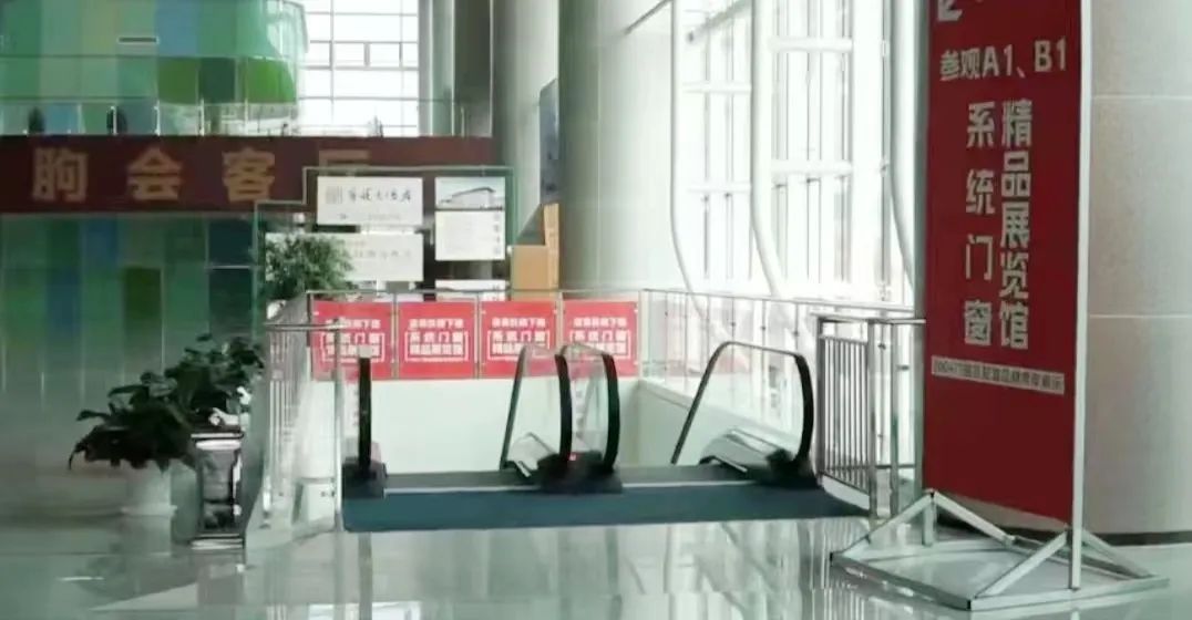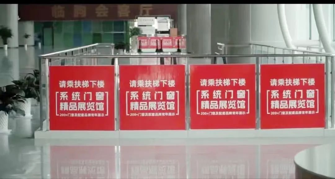 登录厅入口为二楼,进入大厅可以直击开幕式的现场!入口左右两侧都有扶手梯指示牌,通往一楼的系统门窗常年展馆(A1、B1展馆)。